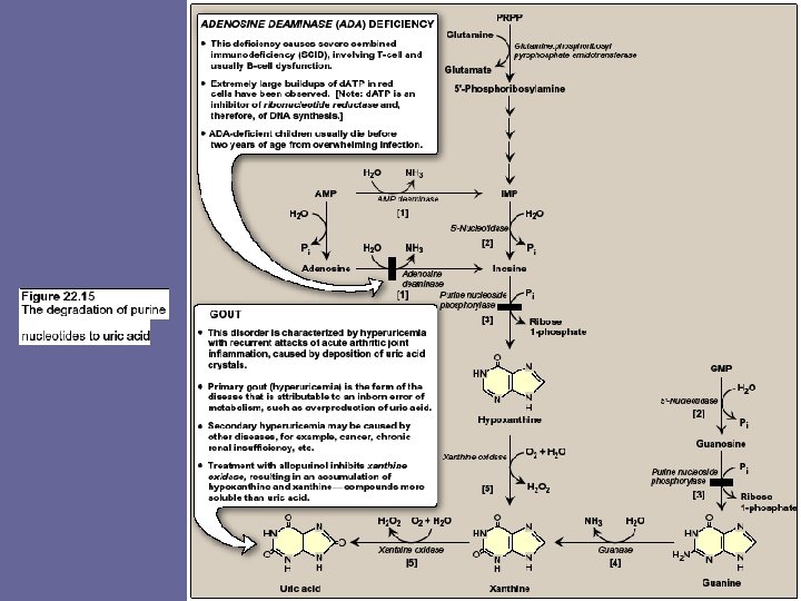 V. Degradation of Purine Nucleotides • Degradation of dietary NAs occurs in the small intestine, where a family of pancreatic enzymes hydrolyzes the nucleotides to nucleosides and free bases. • Inside cells, purine nucleotides are sequentially degraded by specific enzymes, with uric acid as the end product of this pathway. [Note: Mammals other than primates oxidize uric acid further to allantoin, which, in some organisms other than mammals, may be further degraded to urea or ammonia. ]