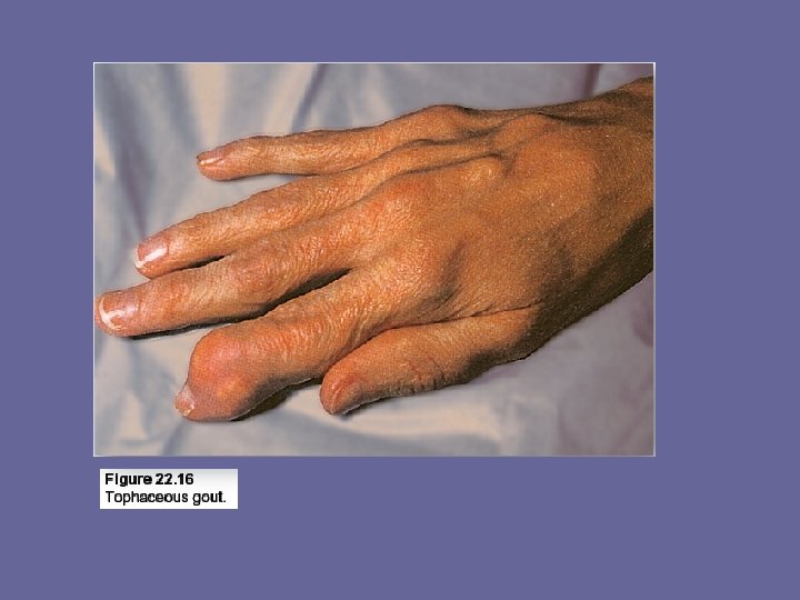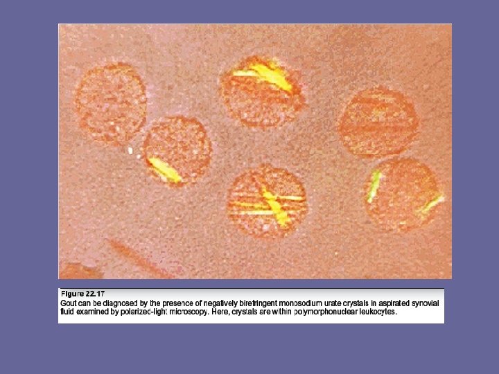 C. Diseases associated with purine degradation 1. Gout: Gout is a disorder characterized by high levels of uric acid—the end product of purine catabolism—in blood (hyperuricemia), as a result of either the overproduction or underexcretion of uric acid. - The hyperuricemia leads to the deposition of monosodium urate crystals in the joints, and an inflammatory response to the crystals, causing first acute and then to chronic gouty arthritis. - Nodular masses of monosodium urate crystals (tophi) may be deposited in the soft tissues, resulting in chronic tophaceous gout. - Formation of uric acid stones in the kidney may also be seen. [Note: Hyperuricemia is typically asymptomatic and does not lead to gout, but gout is preceded by hyperuricemia. ] - The definitive diagnosis of gout requires aspiration and examination of synovial fluid from an affected joint (or material from a tophus) using polarized light microscopy to confirm the presence of needle-shaped monosodium urate crystals.