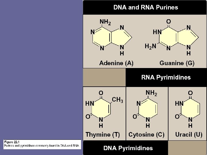 Nucleotide structure • Nucleotides are composed of a nitrogenous base (purine/pyrimidine), a pentose, and 1, 2 or 3 phosphate groups. Purine and pyrimdine structures • Both DNA and RNA contain purine bases: adenine (A) and guanine (G). • Both DNA and RNA contain cytosine (C) • DNA contains thymine (T), whereas RNA contains uracil (U). T and U differ by one methyl group