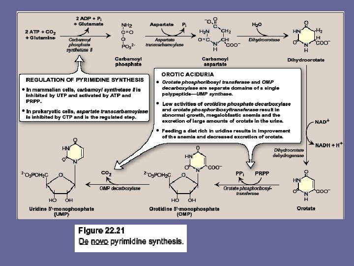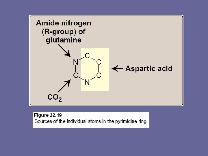VI. Pyrimidine Synthesis and Degradation • Unlike the synthesis of the purine ring, which is constructed on a preexisting ribose 5 -phosphate, the pyrimidine ring is synthesized before being attached to ribose 5 -phosphate, which is donated by PRPP. • The sources of the atoms in the pyrimidine ring are glutamine, CO 2, and aspartic acid. [Note: Glutamine and aspartic acid are thus required for both purine and pyrimidine synthesis. ]