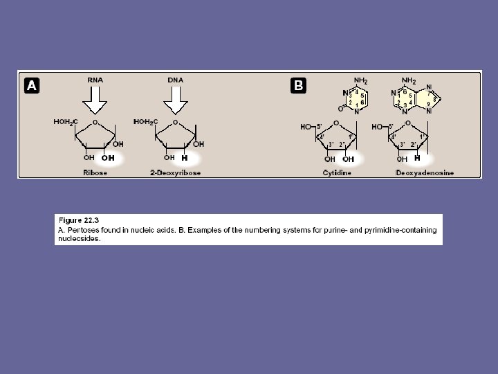 Nucleosides • Pentose sugar + N-base = nucleoside (ribonucleoside/ deoxyribonucleosides). • Ribonucleosides of A, G, C and U = adenosine, guanosine, cytidine, uridine • Deoxyribonucleosides have the added prefix “deoxy” • Carbon and nitrogen atoms in base and sugar are numbered separately