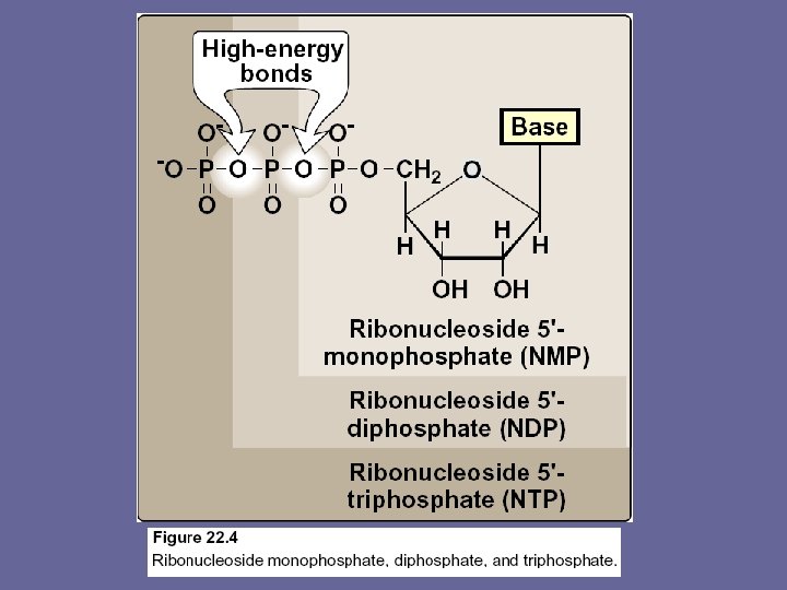 Nucleotides • Nucleotides are mono-, di-, or triphosphate esters of nucleosides. The 1 st phosphate group is attached by an ester linkage to the 5`-OH of pentose. This compound = nucleoside 5`-phosphate or 5`-nucleotide • If one phosphate is attached, the structure = nucleoside monophosphate (NMP) e. g. , AMP, CMP • If a 2 nd or 3 rd phosphate is added, a nucleoside diphosphate (e. g. , ADP) or triphosphate (e. g. , ATP) • The 2 nd and 3 rd phosphates are connected by a ”highenergy” bond. • Phosphate groups give negative chrges to nucleotides, and cause DNA and RNA to be referred to as “nucleic acids”.