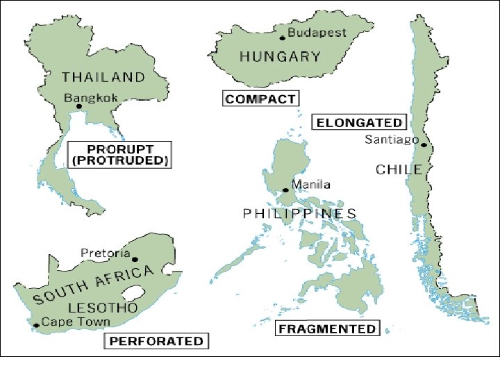 5 basic shapes: – Compact (Uruguay, Zimbabwe, Poland) – Prorupt (extension out; Thailand) – Elongated (Chile) – Fragmented (difficult to defend; Philippines, Indonesia) – Perforated (country that surrounds another; South Africa