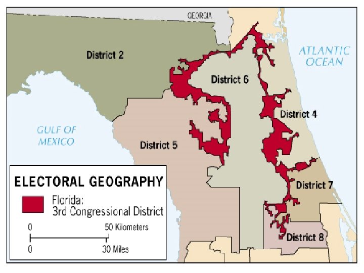 Electoral Geography Gerrymandering: redrawing of voting districts to benefit 1 political party • protects minority districts