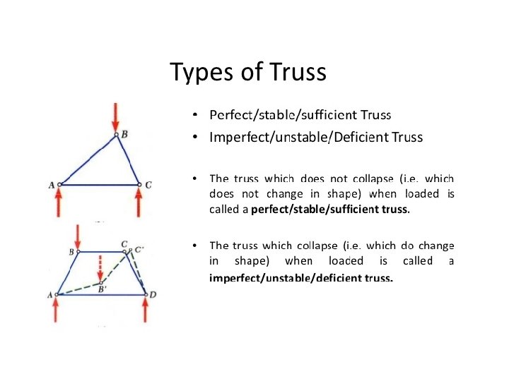 Classification of truss: • Truss: • 1. Perfect truss: • 2. Imperfect truss: a. Redundant truss b. Defficient truss