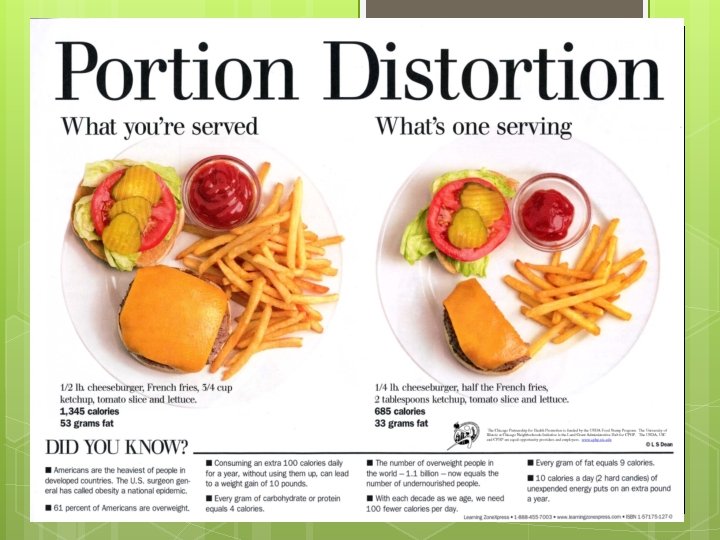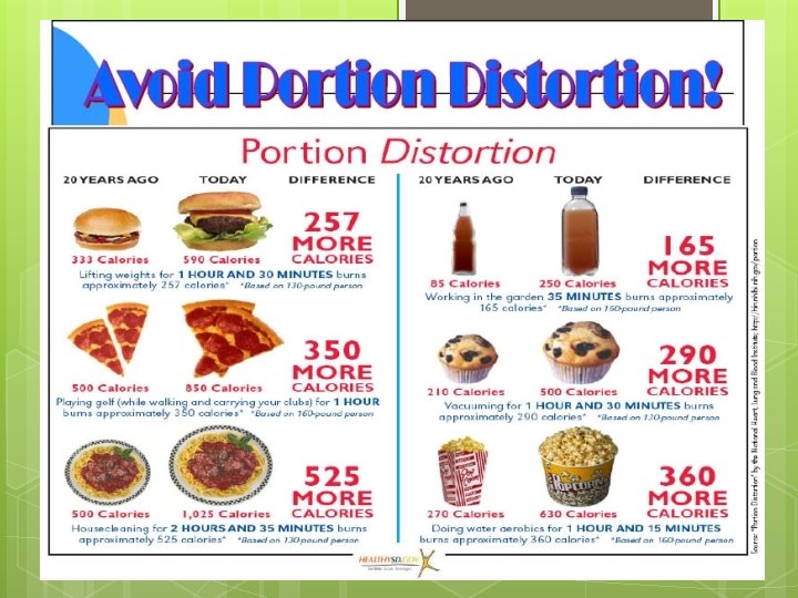 Over the Years… Portion sizes of everything have grown majorly 1970’s 47% Americans were overweight/obese Now 68% are overweight/obese Increase sizes Higher calories Eat more Distort perceptions of appropriate food quantities Sedentary lifestyles