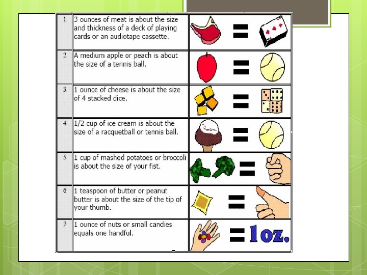 How do you know correct portion sizes? Think of common objects Baked potato Computer mouse Meat Deck of cards Rice Tennis ball Cheese 1 -inch dice