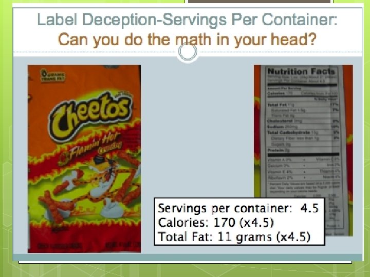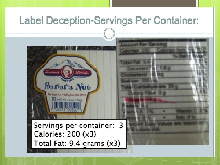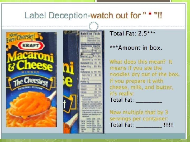 How companies might deceive you on a food label: see example s on next slides… 1. Unrealistic serving size - Many Chips 2. Servings per container - Muffin, Cheetos 3. Packaging- pop tart- 2 in one PACKAGE 4. Listing an amount and then having a “ * ” - Mac n’ Cheese