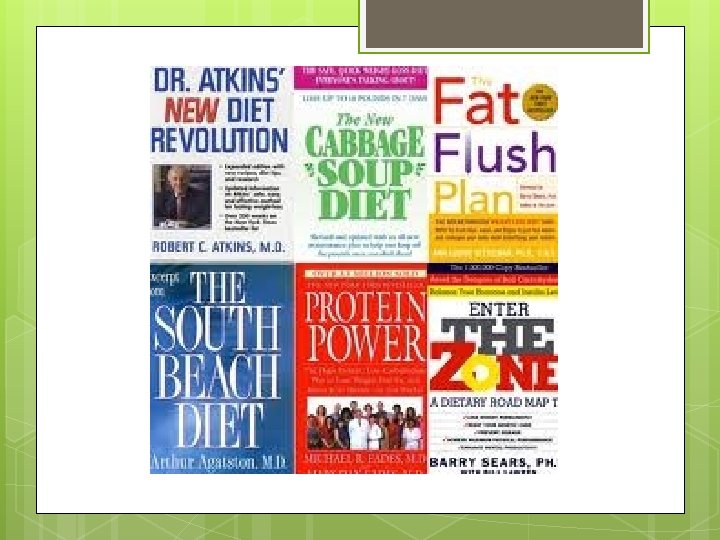 Examples of Fad Diets Acai Berry Diet- Has been extremely popular since promoted on the Oprah Show. Atkins Diet- Written in the 1970’s but became popular in the last few years. Low Fat Diet- Very popular between the 1980’s and 1990’s http: //www. youtube. com/watch? v=V 9 ke. K-_BJg 4 (4: 30)