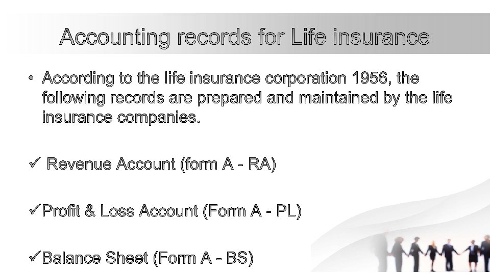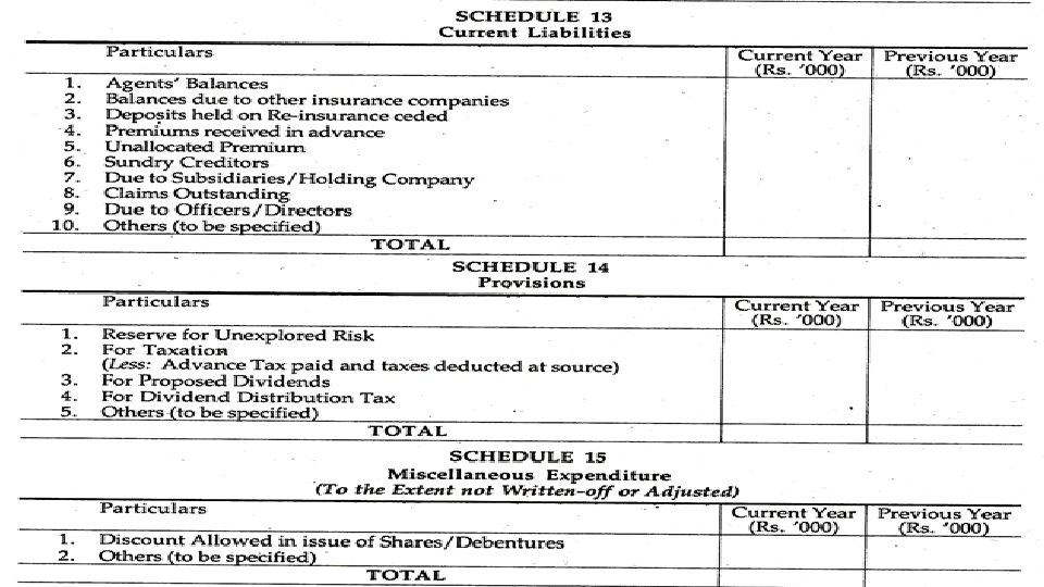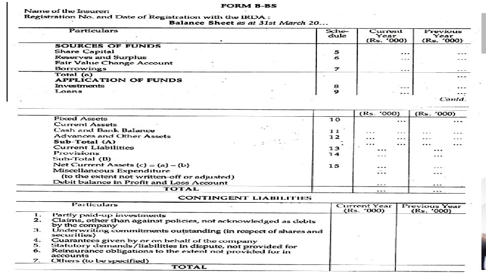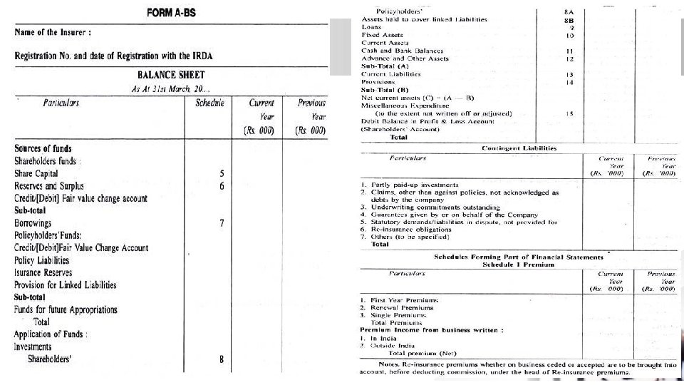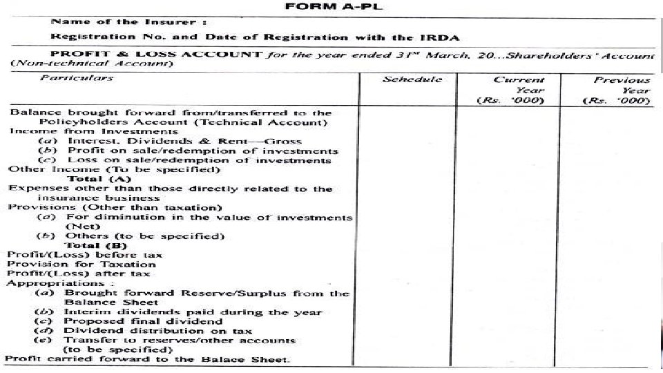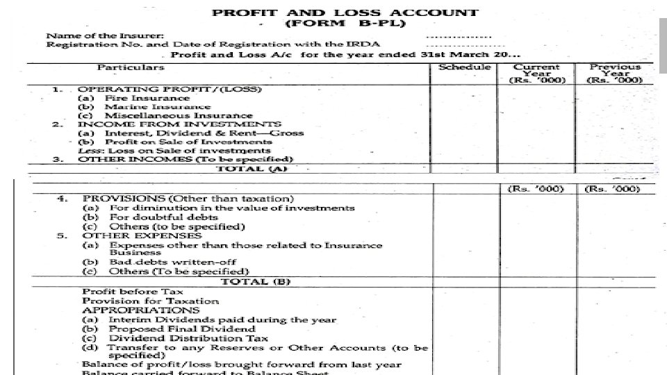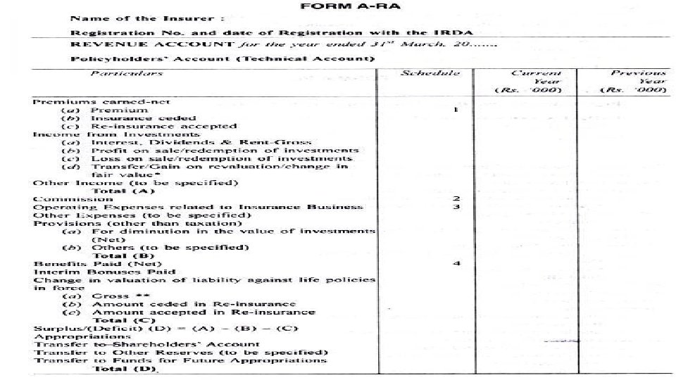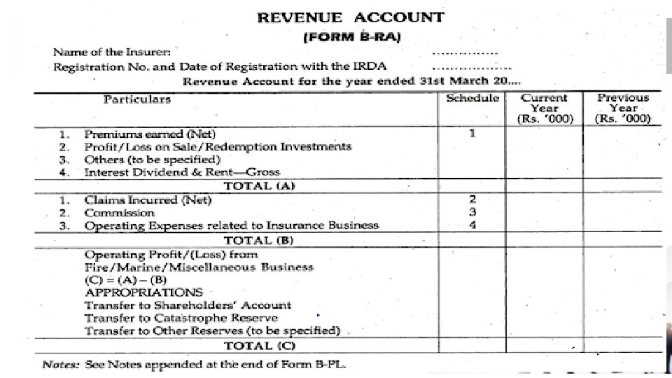 • According to IRDA regulations 2002 the following accounts are to be prepared for the general insurance contracts. ü Revenue Account (Form B – RA) ü Profit and Loss Account (Form B – PL) ü Balance Sheet (Form B – BS)