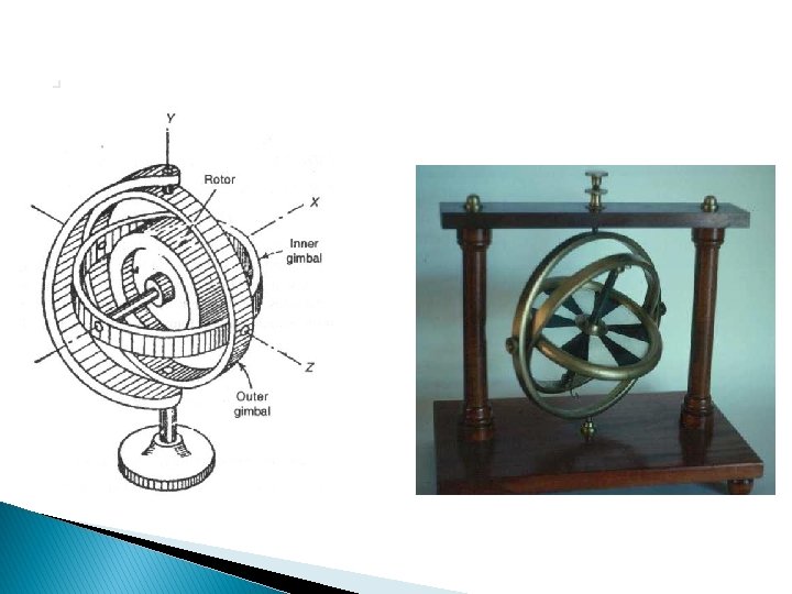 Gyroscopes A gyroscope is a device for measuring or maintaining orientation, based on the principles of conservation of angular momentum. � A mechanical gyroscope is essentially a spinning wheel or disk whose axle is free to take any orientation. This orientation changes much less in response to a given external torque than it would without the large angular momentum associated with the gyroscope's high rate of spin. Since external torque is minimized by mounting the device in gimbals, its orientation remains nearly fixed, regardless of any motion of the platform on which it is mounted. � Gyroscopes based on other operating principles also Exit, such as the electronic, microchip-packaged MEMS gyroscope devices found in consumer electronic devices, solid state ring lasers, fiber optic gyroscopes and the extremely sensitive quantum gyroscope. � Applications: navigation (INS) when magnetic compasses do not work or are not precise enough or for the stabilization of flying vehicles like radio-controlled helicopters. maintain direction in tunnel mining. �