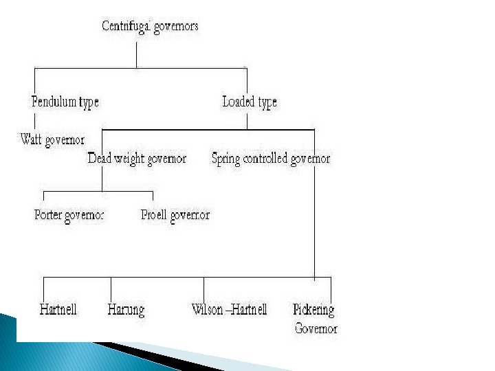 Classification of governors: � Governors are classified based upon two different categories. These are: 1. Centrifugal governors 2. Inertia governors Centrifugal governors: � The centrifugal governors are working based on the balancing of centrifugal force on the rotating balls by an equal and opposite radial force, known as the controlling force. � It consists of two balls of equal mass, which are attached to the arms. These balls are known as governor balls or fly balls.