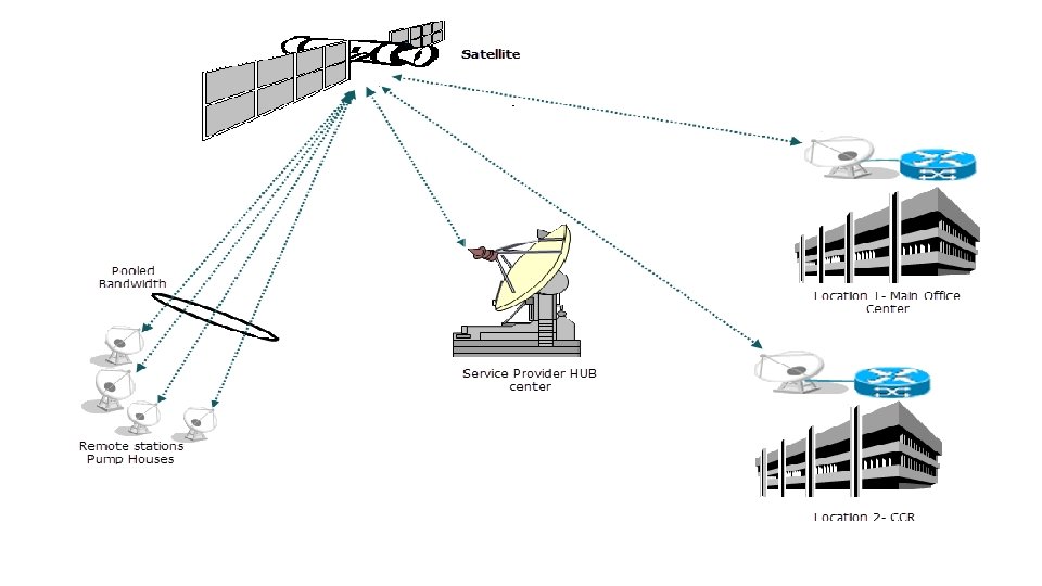 Satellite Internet access üSatellite Internet access is Internet access provided through communications satellites. ü Modern satellite Internet service is typically provided to users through geostationary satellites that can offer high data speeds, with newer satellites using Ka band to achieve downstream data speeds up to 50 Mbps. üSatellite Internet generally relies on three primary components: a satellite in geostationary orbit ( sometimes referred to as a geosynchronous Earth orbit, or GEO), a number of ground stations known as gateways that relay Internet data to and from the satellite via radio waves (microwave), and a VSAT (verysmallaperture terminal) dish antenna with a transceiver, located at the subscriber's premises. üOther components of a satellite Internet system include a modem at the user end which links the user's network with the transceiver, and a centralized network operations center ( NOC) for monitoring the entire system