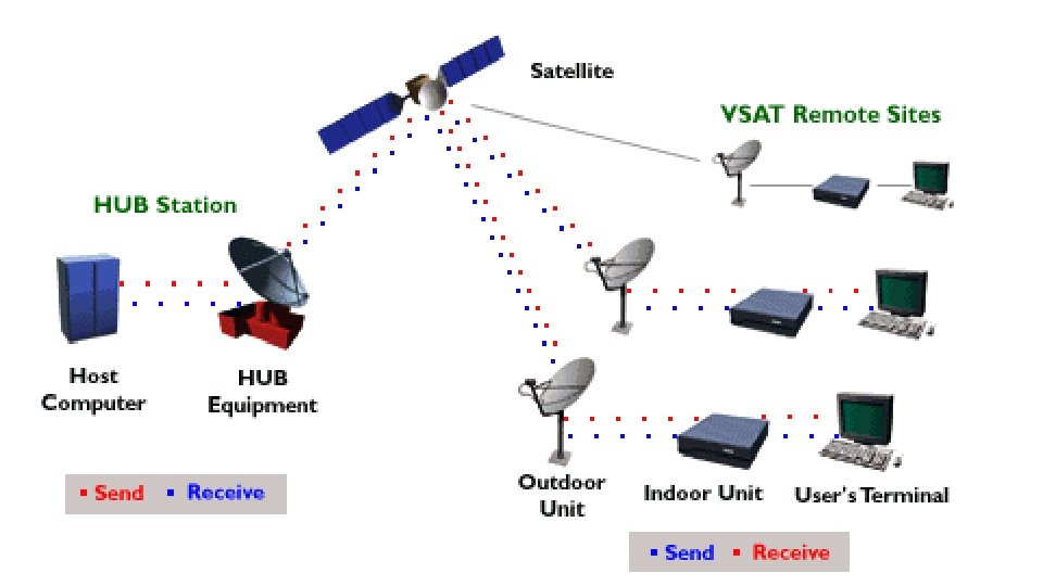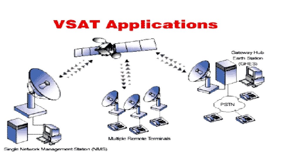 VSAT network üThe basic structure of a VSAT network consists of a hub station which provides a broadcast facility to all the VSATs in the network and the VSATs themselves which access the satellite in some form of multiple- access mode. üThe hub station is operated by the service provider, and it may be shared among a number of users, but of course, each user organization has exclusive access to its own VSAT network. üTime division multiplex is the normal downlink mode of transmission from hub to the VSATs, and the transmission can be broadcast for reception by all the VSATs in a network, or address coding can be used to direct messages to selected VSATs. üA form of demand assigned multiple access (DAMA) is employed in some systems in which channel capacity is assigned in response to the fluctuating demands of the VSATs in the network. üMost VSAT systems operate in the Ku band, although there are some C band systems in existence (Rana et al. , 1990).