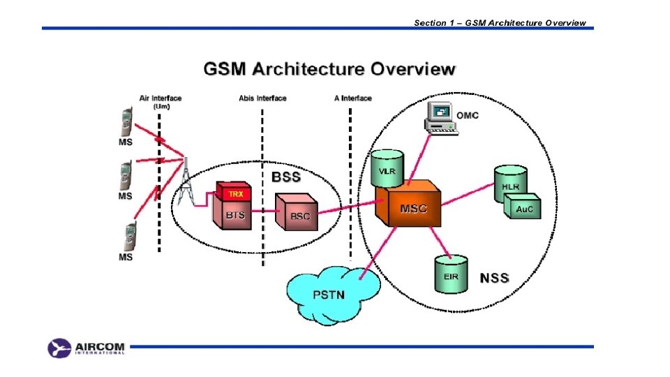 • The Network and Switching Sub-System (NSS) T v. The NSS provides the switching between the GSM subsystem and external networks along with the databases used for additional subscriber and mobility management. üMajor components in the NSS include Øthe Mobile Services Switching Center (MSC), ØHome and Visiting Location Registers (HLR, VLR). Ø The HLR and VLR databases are interconnected through the telecomm standard Signaling System 7 (SS 7) control network. üThe Operation Sub-System (OSS) üThe OSS provides the support functions responsible for the management of network maintenance and services. üComponents of the OSS are responsible for network operation and maintenance, mobile equipment management, and subscription management and charging.
