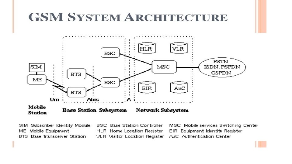 GSM architecture includes several subsystems üThe Mobile Station (MS) • These digital telephones include vehicle, portable and hand-held terminals. • A device called the Subscriber Identity Module (SIM) that is basically a smart-card provides custom information about users such as the services they've subscribed to and their identification in the network üThe Base Station Sub-System (BSS) • The BSS is the collection of devices that support the switching networks radio interface. • Major components of the BSS include the Base Transceiver Station (BTS) that consists of the radio modems and antenna equipment. • In OSI terms, the BTS provides the physical interface to the MS where the BSC is responsible for the link layer services to the MS. • Logically the transcoding equipment is in the BTS, however, an additional component