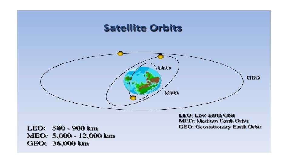 Satellite orbits in terms of the orbital height v. According to distance from earth: ü Geosynchronous Earth Orbit (GEO) , ü Medium Earth Orbit (MEO), ü Low Earth Orbit (LEO)