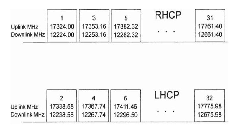 Power Rating and Number of Transponders • satellite will be seen that satellites primarily intended for DBS have a higher [EIRP] than for the other categories, being in the range 51 to 60 d. BW. • At a Regional Administrative Radio Council (RARC) meeting in 1983, the value established for DBS was 57 d. BW. • Transponders are rated by the power output of their high-power amplifiers. • Typically, a satellite may carry 32 transponders. • If all 32 are in use, each will operate at the lower power rating of 120 W. • The available bandwidth (uplink and downlink) is seen to be 500 MHz. • A total number of 32 transponder channels, each of bandwidth 24 MHz, can be accommodated. • The bandwidth is sometimes specified as 27 MHz, but this includes a 3 MHz guardband allowance. Therefore, when calculating bit-rate capacity, the 24 MHz value is used. • The total of 32 transponders requires the use of both right- hand circular polarization (RHCP) and left-hand circular polarization (LHCP) in order to permit frequency reuse, and guard bands are inserted between channels of a given polarization.