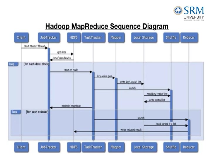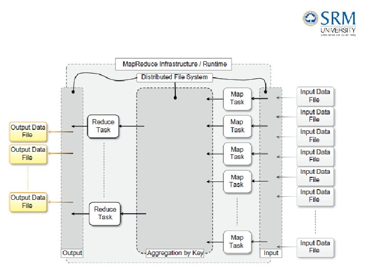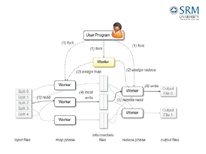 • Prepare the Map() input – the “Map. Reduce system” designates Map processors, assigns the K 1 input key value each processor would work on, and provides that processor with all the input data associated with that key value. • Run the user-provided Map() code – Map() is run exactly once for each K 1 key value, generating output organized by key values K 2. • “Shuffle” the Map output to the Reduce processors – the Map. Reduce system designates Reduce processors, assigns the K 2 key value each processor would work on, and provides that processor with all the Map-generated data associated with that key value. • Run the user-provided Reduce() code – Reduce() is run exactly once for each K 2 key value produced by the Map step. • Produce the final output – the Map. Reduce system collects all the Reduce output, and sorts it by K 2 to produce the final outcome.