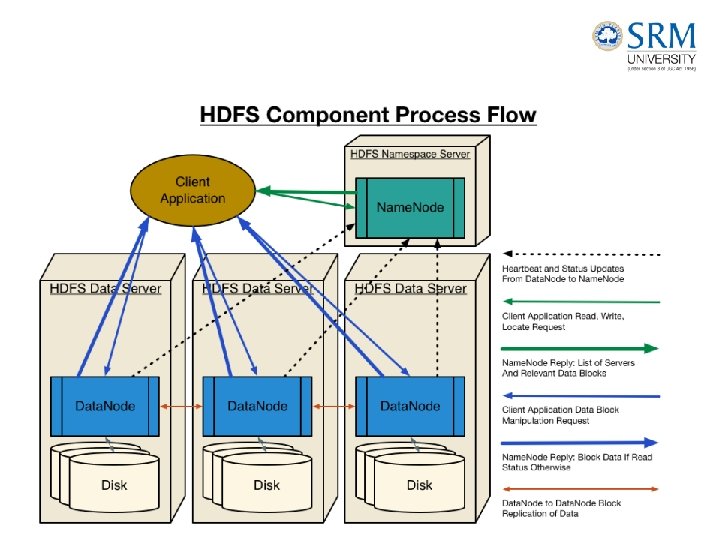 The basic functionalities of Hadoop Distributed File System (HDFS) • Large files are split into blocks of equal size • These blocks are distributed across the cluster for storage • Because node failure is a reality to be considered in a larger cluster, each block is stored multiple times (typically three times) on different computers
