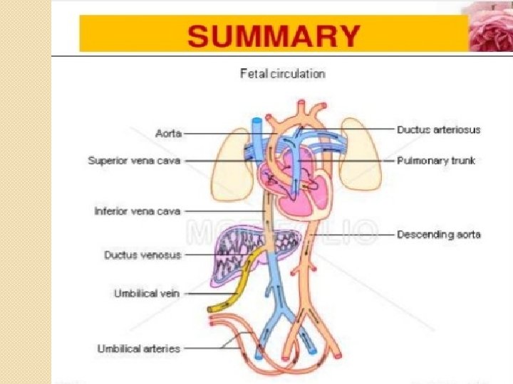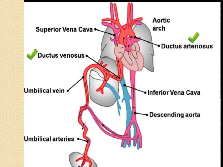 Continue… Ø From cranial end blood returns through anterior venacava to the right atrium Ø This blood along with blood from abdominal venacava passes into the right ventricle Ø The right ventricular blood goes via pulmonary trunk going to the descending aorta through Ductus Arteriosus because fetal lungs become inactive Ø Ductus Arteriosus is a arterial duct which connects the pulmonary artery with the aorta ( In the fetus there is special connection between the pulmonary artery and the aorta, called Ductus Arteriosus) Ø At birth it becomes occluded but in adult it persists as a ligament (Ligamentum Arteriosum) Ø Some of the blood moves from the aorta through the internal iliac arteries and re-enters the placenta, the maternal circulation