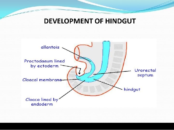 HIND GUT Ø It is the caudal part of the primitive gut tube, and separated from the ectoderm by clocal membrane (bilaminar membrane) Ø Hind gut is divided into two parts: pre-allantoic part and post allantoic part pre-allantoic part Descending colon post allantoic part Primitive urogenital sinus Rectum Ø The splanchnopleuric layer of the mesoderm after enclosing the gut with its muscular, fibrous and serous layer forms primitive dorsal mesentery Ø The dorsal mesentery suspends the gut from the dorsal wall and gives passage to blood vessels Ø Celiac artery supplies the abdominal part of the fore gut, cranial mesenteric artery supplies the mid gut and caudal mysentric artery supplies the hind gut