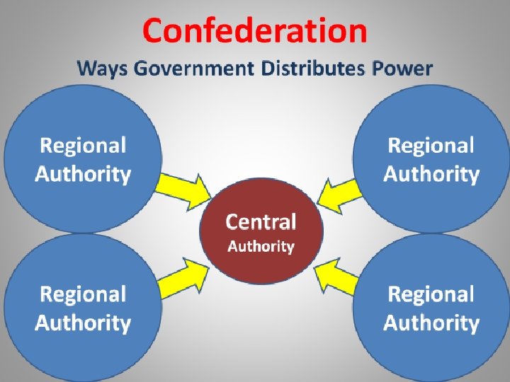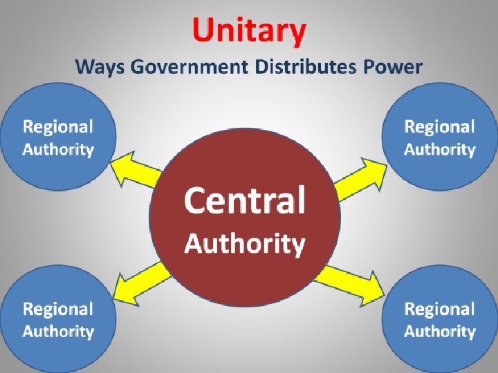 Local/ State Gov’t Central Gov’t UNITARY Central Gov’t CONFEDERATION Central Gov’t Local/ State Gov’t FEDERATION