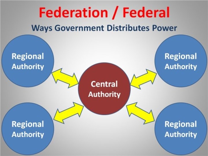 Unitary - One central government controls weaker states. Power is not shared between states, counties, or provinces. Confederation - A weak or loose organization of states that agree to follow a central government. Each state makes its own laws and the central government is only concerned about defense and trade. Federal - Power is shared by a powerful central government and states or provinces that have self-rule, usually through their own legislatures.