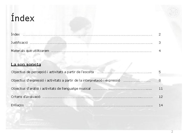 Escoltar i reconèixer intervals de 2 a i 3 a. ● Cantar: ● Un cop cantades les cançons, tocar diferents intervals al piano i reconèixer si aquests són de 2 a o de 3 a, relacionant-los amb les cançons. ● Escoltar parelles de 3 es M i m seguides i saber reconèixer l’ordre en què s’han tocat a partir de la cançó de “L’advocat”. 7