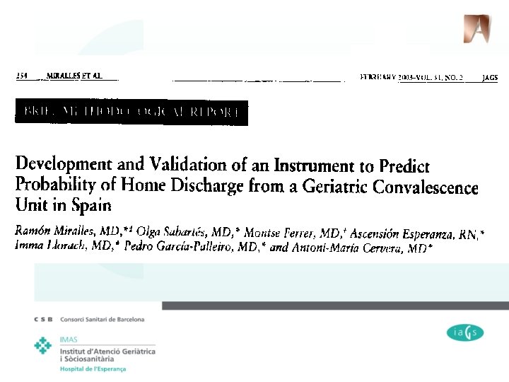 Factores predictivos de deterioro funcional durante la hospitalización en agudos (modelo regresión logística) (evaluados en el momento del ingreso) OR Deterioro AVDs instrumentales previo al ingreso (lawton <5) 2, 6 (<0, 01) Edad >85 años 3, 5 (<0, 01) Deterioro cognitivo (MMSE abrev <14 puntos) 1, 8 (<0, 05) Sager et al MA et al. Hospital admission risk profile: Identifyng older patients at risk for functional decline Following acute medical illness and hospitalization. J Am Geriatr Soc 1996; 44: 251 -257.