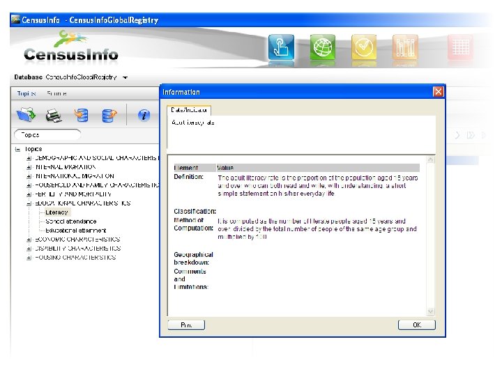 United Nations Statistics Division Main features of Census. Info is user and administrator friendly software Disseminates census results at any geographical level Disseminates census results for multiple censuses Provides a suggested list of census topics, data and indicators with accompanying metadata (based on UN recommendations) United Nations Regional Workshop on Census. Info for Dutch Speaking Caribbean Countries Oranjestad, Aruba, 26 -30 November 2012