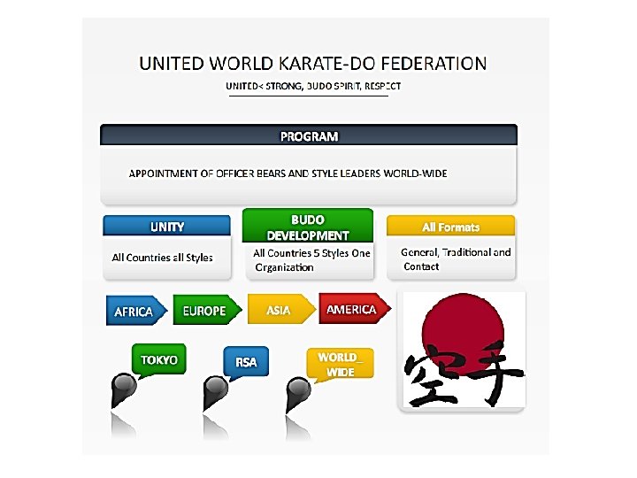 First Unify Japan, the World shall follow the Masters A task difficult but not impossible • Karate can not be treated at par with other sports because of its master & style-centric characteristics • Major styles and their Masters are to be Unified in Japan first followed by worldwide unification of all the styles • Each country to follow the path where “Budo” code amalgamates with sporting principles