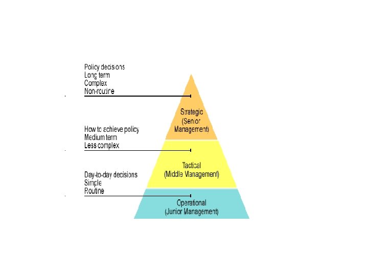 • Strategic decisions are long term, complex decisions made by senior management. These decisions will affect the entire direction of the firm. • Tactical decisions are medium term, less complex decisions made by middle managers. They follow on from strategic decisions and aim to meet the objectives stated in any strategic decision. For example in order to become the market leader, a firm may have to launch new products/services or open new branches. • Operational decisions are day to day decisions made by junior managers that are simple and routine. This could involve the regular ordering of supplies