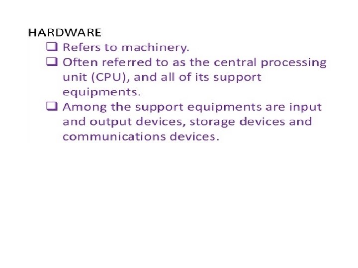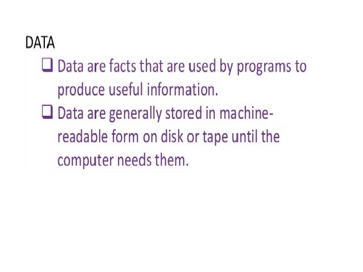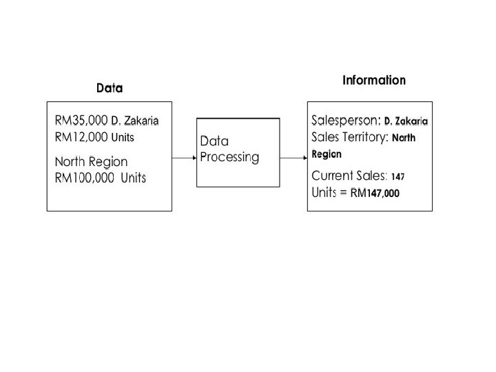 • Information means data that have been shaped into a form that is meaningful and useful to humans beings. • Data are streams of raw facts representing events occurring in org. or physical environment before being in a form understandable to humans. 3 activities in IS produce the information are input, output, and processing.
