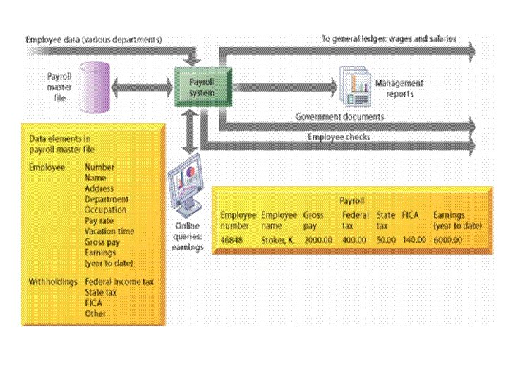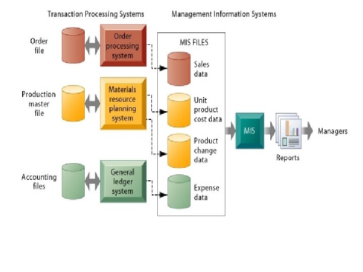 Example • • • support operational managers by keeping track of the elementary activities and transactions of the organization, such as sales, receipts, cash deposits, payroll, credit decisions, and the flow of materials in a factory. The principal purpose of systems at this level is to answer routine questions and to track the flow of transactions through the organization. How many parts are in inventory? What happened to Mr. Williams's payment? How many hours worked each day by employees on a factory floor.