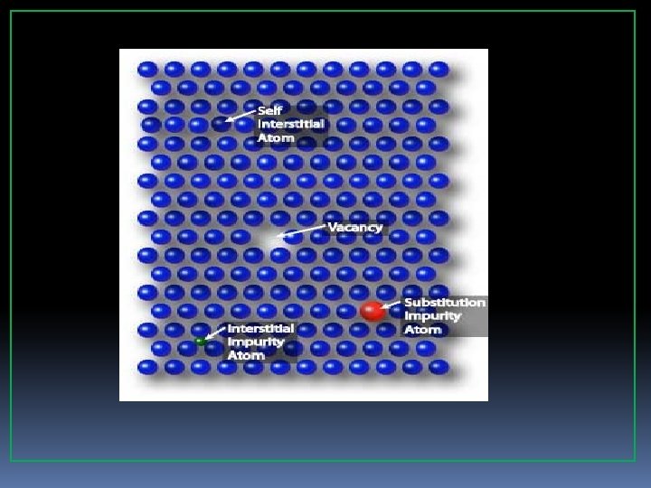 Defects Point defects (0 -dimensional) 1. Vacancies or Schottky 2. Interstitialcies or Frenkel 3. Compositional defects. a. Substitutional b. interstitial 4. Electronic defects Line defects (1 -dimensional) 1. Edge dislocation 2. Screw dislocation Surface defects (2 -dimensional) Volume defects (3 -dimensional) 1. Grain boundaries 2. Tilt boundaries 3. Twin boundaries 4. Stacking faults 1. Cracks 2. Voids or air bubbles