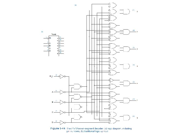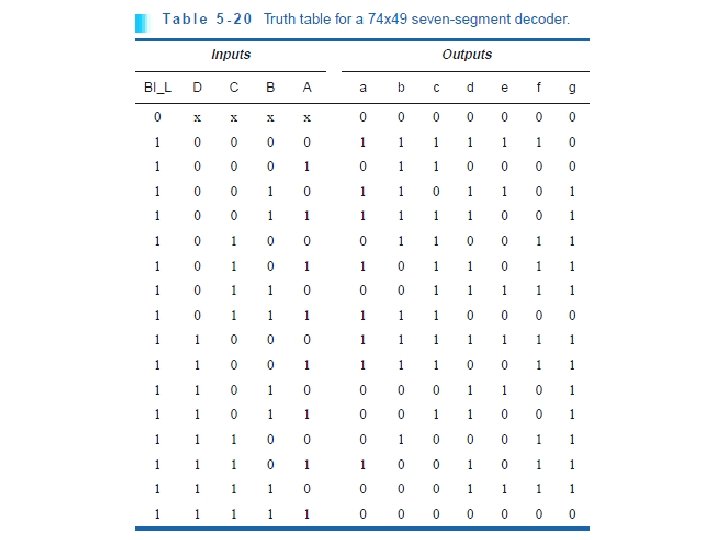 Seven Segment Decoders • A seven-segment decoder has 4 -bit BCD as its input code and the “seven segment code”. • The “blanking input” BI_L, each output of the 74 x 49 is a minimal product-of-sums realization for the corresponding segment, assuming “don’t-cares” for the non-decimal input combinations.