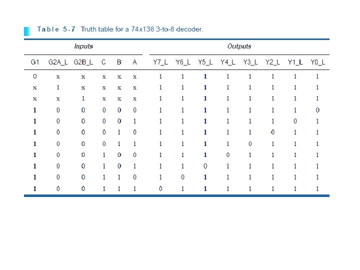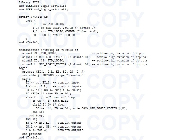 VHDL Program for IC 74 x 138 Process(G 1, G 2 A_L, G 2 B_L, A) Begin case A is when "000" => Y_L_i <= “ 01111111"; when "001" => Y_L_i <= “ 10111111"; when "010" => Y_L_i <= “ 11011111"; when "011" => Y_L_i <= “ 11101111"; when "100" => Y_L_i <= “ 11110111"; when "101" => Y_L_i <= “ 11111011"; when "110" => Y_L_i <= “ 11111101"; when "111" => Y_L_i <= “ 11111110"; when others => Y_L_i <= “ 1111"; end case; if (G 1 and G 2 and G 3)='1' then Y_L <= Y_L_i; else Y <= “ 1111"; end if; end process;