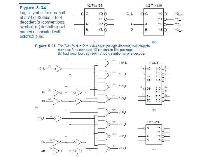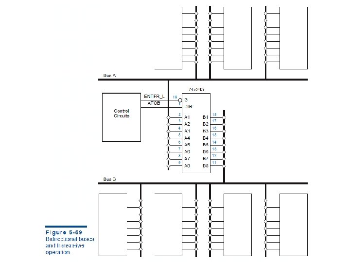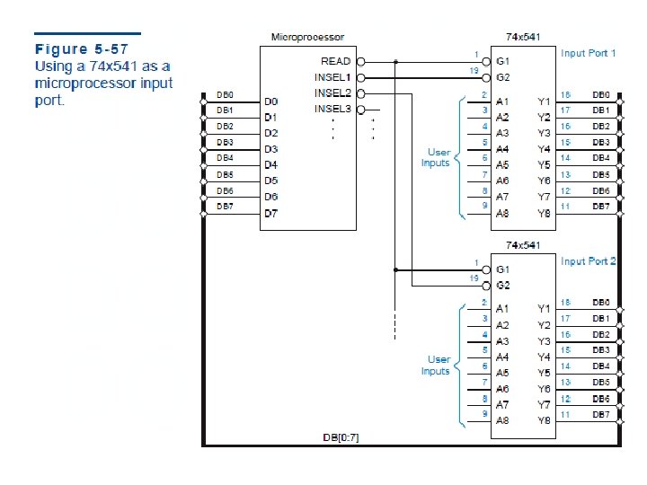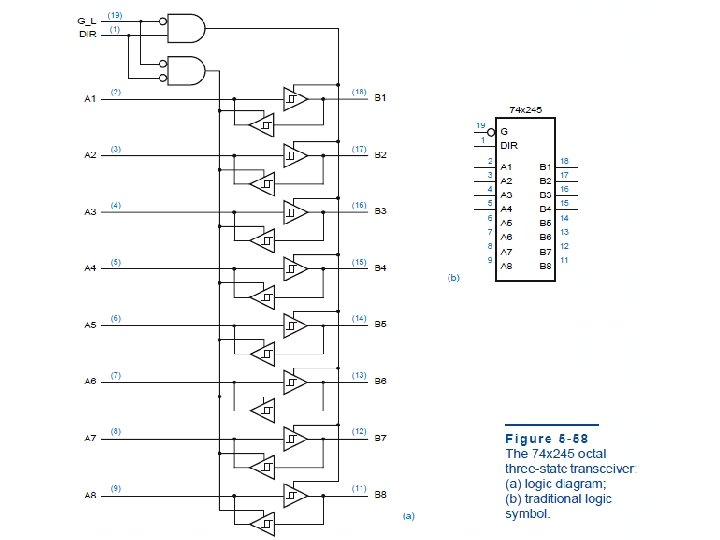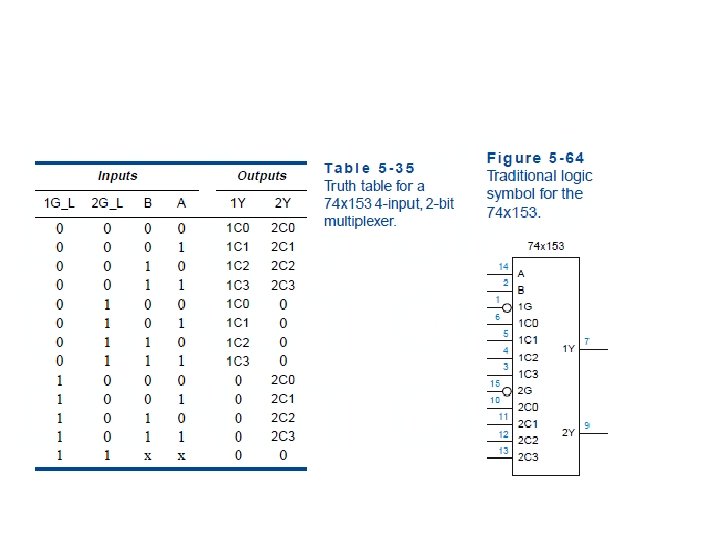Standard SSI and MSI Three-State Buffers • Like logic gates, several independent three-state buffers may be packaged in a single SSI IC. The pinouts of 74 x 125 and 74 x 126, each of which contains four independent noninverting three-state buffers in a 14 -pin package. • The three-state enable inputs in the ’ 125 are active low, and in the ’ 126 they are active high. • Most party-line applications use a bus with more than one bit of data. • For example, in an 8 -bit microprocessor system, the data bus is eight bits wide, and peripheral devices normally place data on the bus eight bits at a time. • Thus, a peripheral device enables eight three-state drivers to drive the bus, all at the same time. Independent enable inputs, as in the ’ 125 and ’ 126, are not necessary. • Thus, to reduce the package size in wide-bus applications, most commonly used MSI parts contain multiple three-state buffers with common enable inputs.
