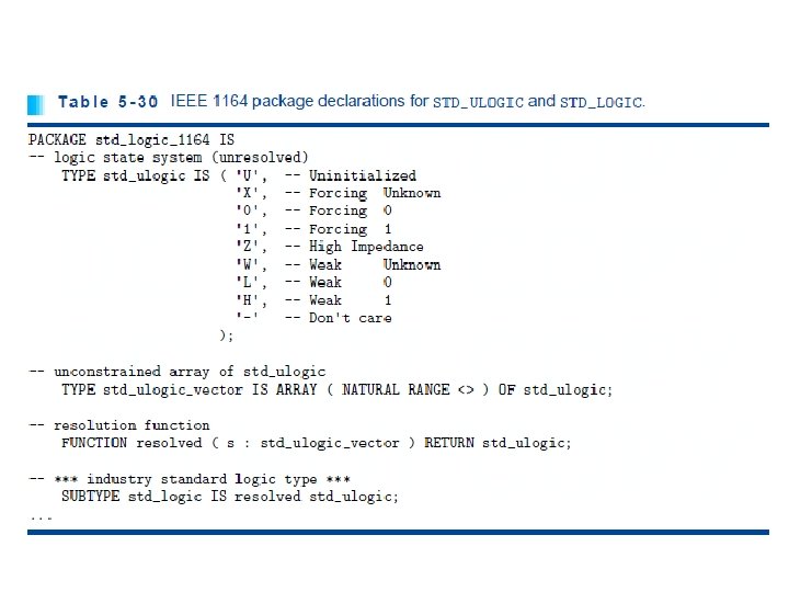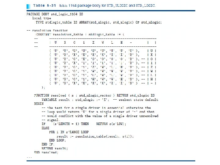 VHDL Program with four 8 -bit three state drivers library IEEE; use IEEE. std_logic_1164. all; entity V 3 statex is port ( G_L: in STD_LOGIC; -- Global output enable SEL: in STD_LOGIC_VECTOR (1 downto 0); -- Input select 0, 1, 2, 3 ==> A, B, C, D: in STD_LOGIC_VECTOR (1 to 8); -- Input buses X: out STD_ULOGIC_VECTOR (1 to 8) -- Output bus (three-state) ); end V 3 statex; architecture V 3 states of V 3 statex is constant ZZZZ: STD_ULOGIC_VECTOR : = ('Z', 'Z', 'Z'); begin process (G_L, SEL, A) begin if G_L='0' and SEL = "00" then X <= To_Std. ULogic. Vector(A); else X <= ZZZZ; end if; end process; process (G_L, SEL, B) begin if G_L='0' and SEL = "01" then X <= To_Std. ULogic. Vector(B); else X <= ZZZZ; end if; end process; process (G_L, SEL, C) begin if G_L='0' and SEL = "10" then X <= To_Std. ULogic. Vector(C); else X <= ZZZZ; end if; end process; process (G_L, SEL, D) begin if G_L='0' and SEL = "11" then X <= To_Std. ULogic. Vector(D); else X <= ZZZZ; end if; end process; end V 3 states;