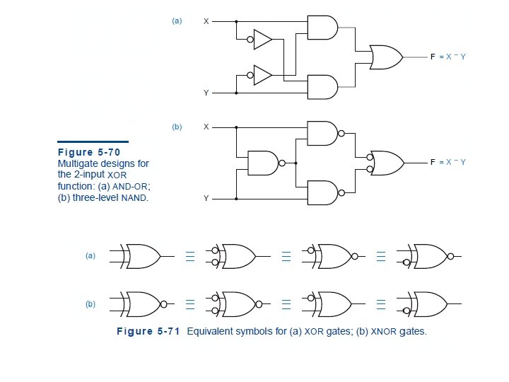 EXCLUSIVE OR and EXCLUSIVE NOR Gates • An Exclusive OR (XOR) gate is a 2 -input gate whose output is 1 if exactly one of its inputs is 1. • An XOR gate produces a 1 output if its inputs are different. • An Exclusive NOR (XNOR) or Equivalence gate is just the opposite—it produces a 1 output if its inputs are the same.