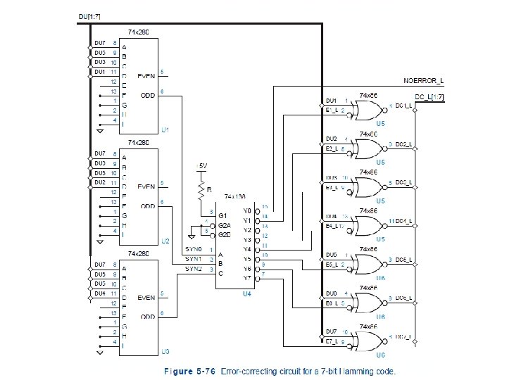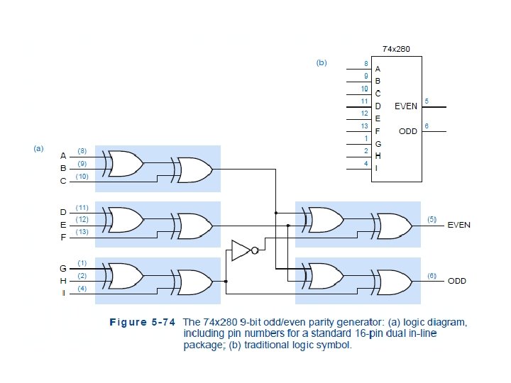 Parity Circuits • Parity Circuits • n XOR gates may be cascaded to form a circuit with n + 1 inputs and a single output. This is called an odd-parity circuit, because its output is 1 if an odd number of its inputs are 1. The circuit in (b) is also an odd parity circuit, but it’s faster because its gates are arranged in a tree-like structure. • If the output of either circuit is inverted, we get an even-parity circuit, whose output is 1 if an even number of its inputs are 1. • The 74 x 280 9 -Bit Parity Generator • Rather than build a multibit parity circuit with discrete XOR gates, it is more economical to put all of the XORs in a single MSI package with just the primary inputs and outputs available at the external pins. • Eg: The 74 x 280 9 -bit parity generator, has nine inputs and two outputs that indicate whether an even or odd number of inputs are 1. • Parity-Checking Applications • The error-detecting codes that use an extra bit, called a parity bit, to detect errors in the transmission and storage of data. In an even parity code, the parity bit is chosen so that the total number of 1 bits in a code word is even. • Parity circuits like the 74 x 280 are used both to generate the correct value of the parity bit when a code word is stored or transmitted, and to check the parity bit when a code word is retrieved or received.