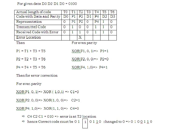 Error Correcting Circuit for 7 -bit Hamming Code • Hamming Codes are a family of linear error-correcting codes that generalize the hamming(7, 4) code. • Hamming codes can detect up to two-bit errors or correct one-bit errors without detection of uncorrected errors. • The simple parity code cannot correct errors, and can detect only an odd number of bits in error. • Hamming codes are perfect codes, i. e. , they achieve the highest possible rate for codes with their block length and minimum distance 3. • Eg: let databits = 0100 = d 3 d 2 d 1 d 0 • Parity bits = P 3 P 2 P 1 3 Bit String 000 001 010 011 100 101 110 111 Parity Bit 0 1 1 0 0 1