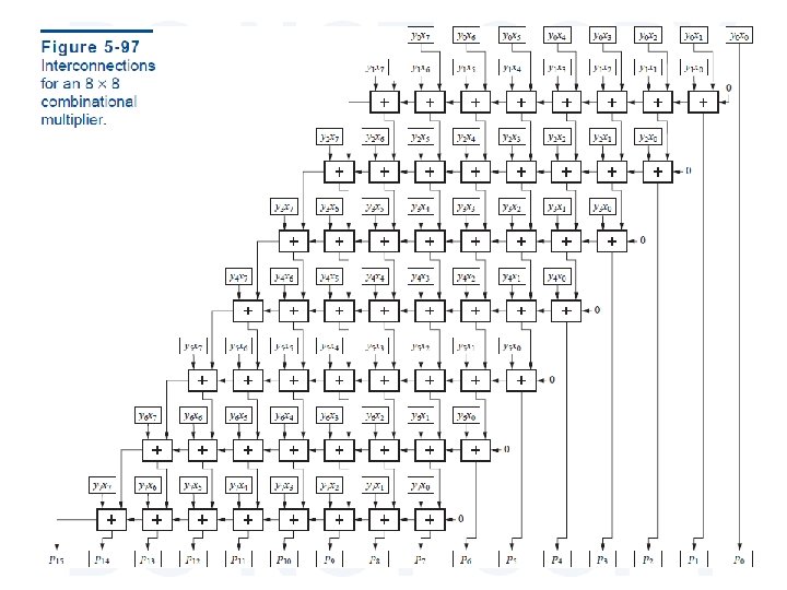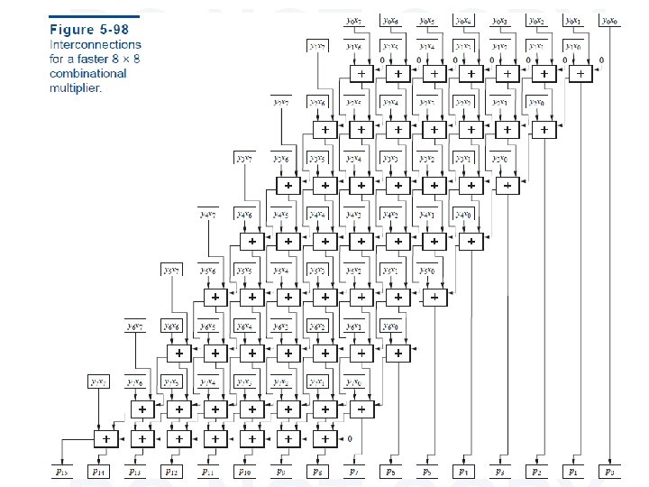 Sequential Multipliers • Sequential multipliers use a single adder and a register to accumulate the partial products. The partial-product register is initialized to the first product component, and for an nxn-bit multiplication, n-1 steps are taken and the adder is used n-1 times, once for each of the remaining n-1 product components to be added to the partial-product register. • Sequential multipliers use carry-save addition to speed up multiplication. The idea is to break the carry chain of the ripple adder to shorten the delay of each addition i. e. , by applying the carry output from bit i during step j to the carry input for bit i+1 during the next step, j+1. • After the last product component is added, one more step is needed in which the carries are hooked up in the usual way and allowed to ripple from the least to the most significant bit. • Although this adder uses exactly the same amount of logic as the previous one (64 2 -input AND gates and 56 full adders), its propagation delay is substantially shorter. • Its worst-case delay path goes through only 14 full adders. The delay can be further improved by using a carry look ahead adder for the last row. • The regular structure of combinational multipliers make them ideal for VLSI and ASIC realization. The importance of fast multiplication in microprocessors, digital video, and many other applications has led to much study and development of even better structures and circuits for combinational multipliers.