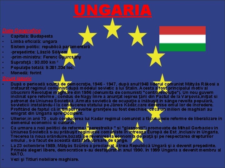 UNGARIA Date Geografice • • Capitala: Budapesta Limba oficială: ungara Sistem politic: republică parlamentară -preşedinte: László Sólyom -prim-ministru: Ferenc Gyurcsány Suprafaţă : 93. 030 km ² Populaţie totală: 9. 381. 334 loc. Monedă: forint Scurt istoric • • • După o perioadă scurtă de democraţie, 1946 - 1947, după anul 1948 liderul comunist Mátyás Rákosi a instaurat regimul comunist după modelul sovietic a lui Stalin. Acesta a fost principalul motiv al izbucnirii Revoluţiei maghiare din 1956 (denumita de comunisti "contrarevoluţie"). Un nou guvern inclinat spre reforme , condus de Nagy Imre a anunţat ieşirea ţării din Pactul de la Varşovia, iniţiat si patronat de Uniunea Sovietică. Armata sovietică de ocupaţie a înăbuşit în sânge revolta populară, sovieticii instalându-l la conducerea statului pe János Kádár, care devenise omul lor de încredere. Profitând de faptul că în timpul revoltei graniţele au fost deschise, circa un milion de maghiari au emigrat din Ungaria spre Occident. Ulterior, in anii 70 , sub conducerea lui Kadar regimul comunist a făcut unele reforme de liberalizare în domeniul economic si cultural. Ca urmare a noii politici de reforme ("perestroika " si "glasnosti") promovate de Mihail Gorbaciov in Uniunea Sovietică s-au prăbuşit regimurile comuniste în întreaga Europă de Est , inclusiv in Ungaria. Trecerea la noua orânduire, bazată pe revenirea la economia de piaţă şi pe respectarea drepturilor omului , s-a facut de această dată fără vărsare de sânge. La 23 octombrie 1989, Mátyás Szűrös a proclamat a treia Republică Ungară şi a devenit preşedinte. Primele alegeri libere, democratice s-au desfăşurat în anul 1990. În 1999 Ungaria a devenit membru al NATO. Vezi şi Titluri nobiliare maghiare.