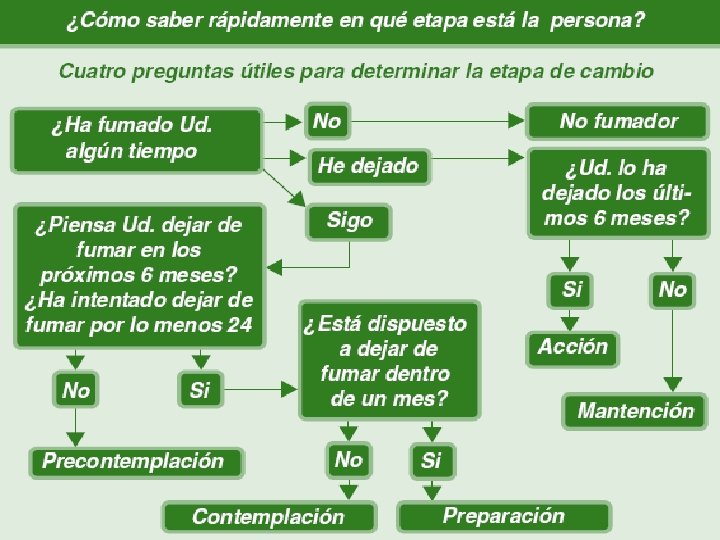 Proceso de cambio Decidiéndose a intentar dejar de fumar Preparación Pensando en dejar de fumar Intentando detenerse Contemplación Acción Recaída Fumador Contento Precontemplación Permaneciendo en abstinencia Mantenimiento