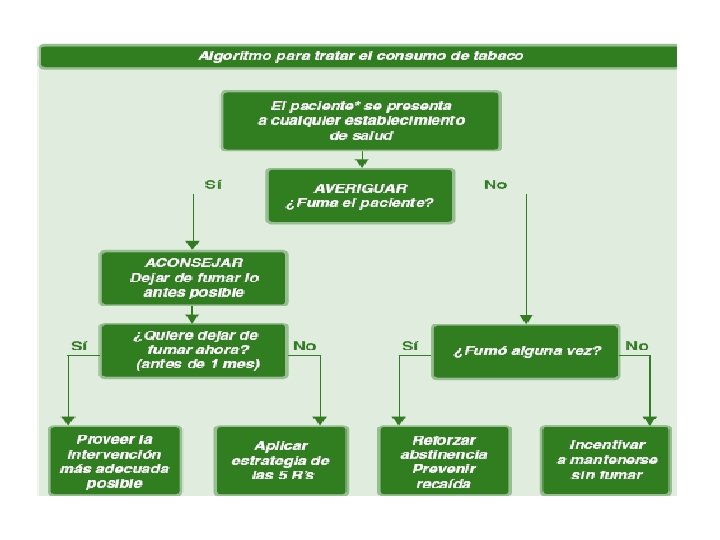 Estrategias para ayudar a las personas a dejar de fumar v Estrategia de las 5 A’s v Estrategia de las 5 R’s -Consejería antitabáquica Breve -Consejería Breve para Fumadoras Embarazadas -Intervención Integral -Grupos de Cesación