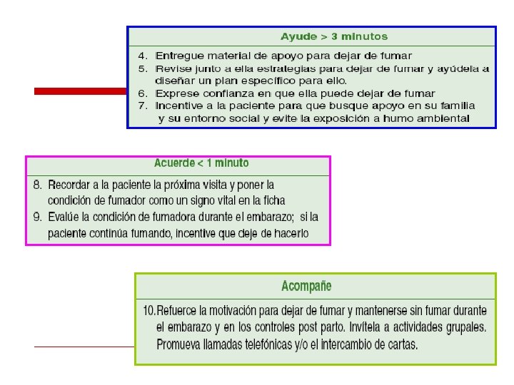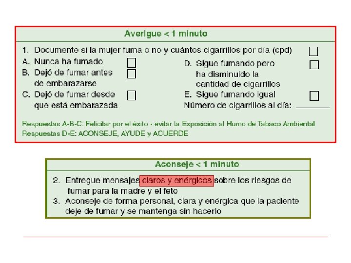 La Consejería Breve para Fumadoras Embarazadas v Se recomienda una intervención corta v Se debe realizar a todas las mujeres embarazadas que consultan en el establecimiento de salud. v Informar a las embarazadas de los riesgos asociados a su condición de embarazo y específicamente de los riesgos del feto. v Tratar de relevar el cambio de la condición personal y de prioridades derivadas de la condición de embarazada y de madre responsable. v Se recomienda utilizar la estrategia de 5 A’s