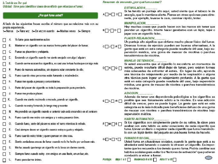 Frases que mejor reflejan cada etapa Precontemplación Contemplación Preparación Acción Yo soy fumador, me gusta y no quiero dejar de fumar. No he pensado siquiera en eso". Yo pienso dejar de fumar algún día, pero no en este momento. Por lo menos NO antes de seis meses. Yo quiero dejar de fumar antes de un mes y quiero saber más de cómo lo puedo lograr Estoy sin fumar, a veces se me hace difícil, tengo algunos problemas, pero los voy a superar Mantenimiento Dejé de fumar hace más de seis meses, mi vida ha cambiado, disfruto de otra forma la vida y quiero saber más acerca de cómo mantenerme libre del tabaco