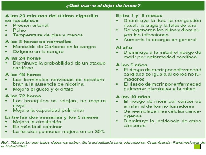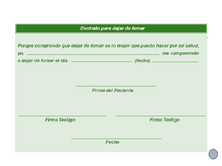 Cesación v Es el proceso de suspender el consumo de tabaco. Recaída v La persona vuelve a fumar después de haber suspendido el consumo de tabaco. v El proceso tiende a ser cíclico: con alta frecuencia las personas recaen y vuelven a un estado en el que por el momento prefieren no cambiar la conducta, para después volver a planteárselo. v Las recaídas forman parte del proceso de cesación y deben constituirse en instancias de aprendizaje. v Habitualmente las personas realizan varios intentos antes de lograr dejar definitivamente de fumar. ¿Si o No?